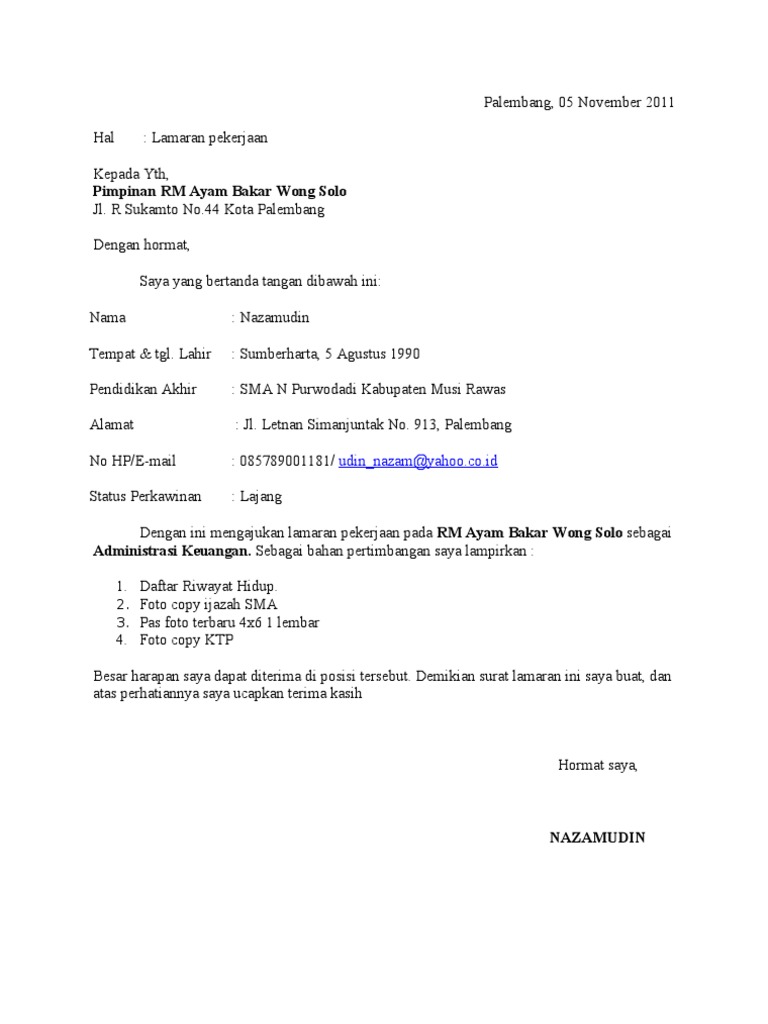 Contoh surat lamaran kerja di rumah makan wong solo Surat Lamaran Kerja Nazam Ke Rm Ayam Bakar Wong Solo